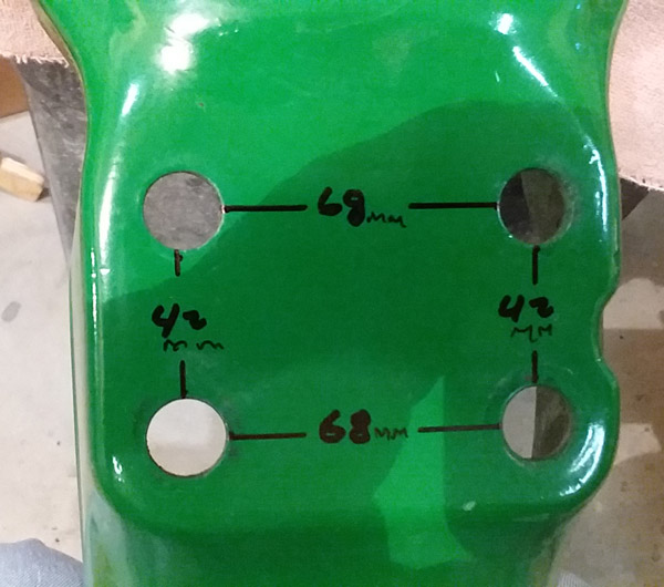 After mangling the job on my bike I got the correct lower tree mounting pattern. Here’s a sample of a 1978 fender. Make a template on the new fender and drill away.